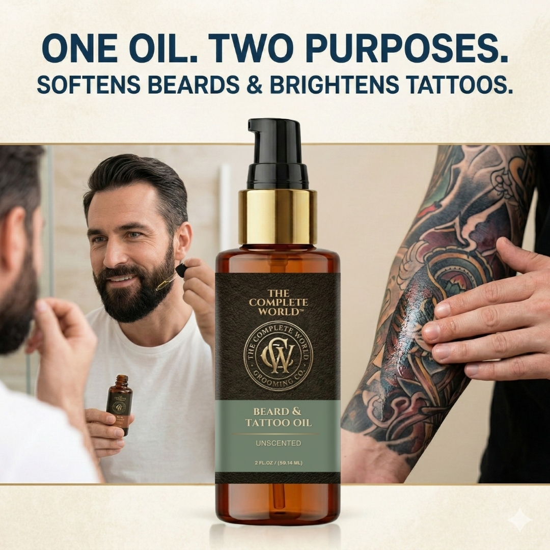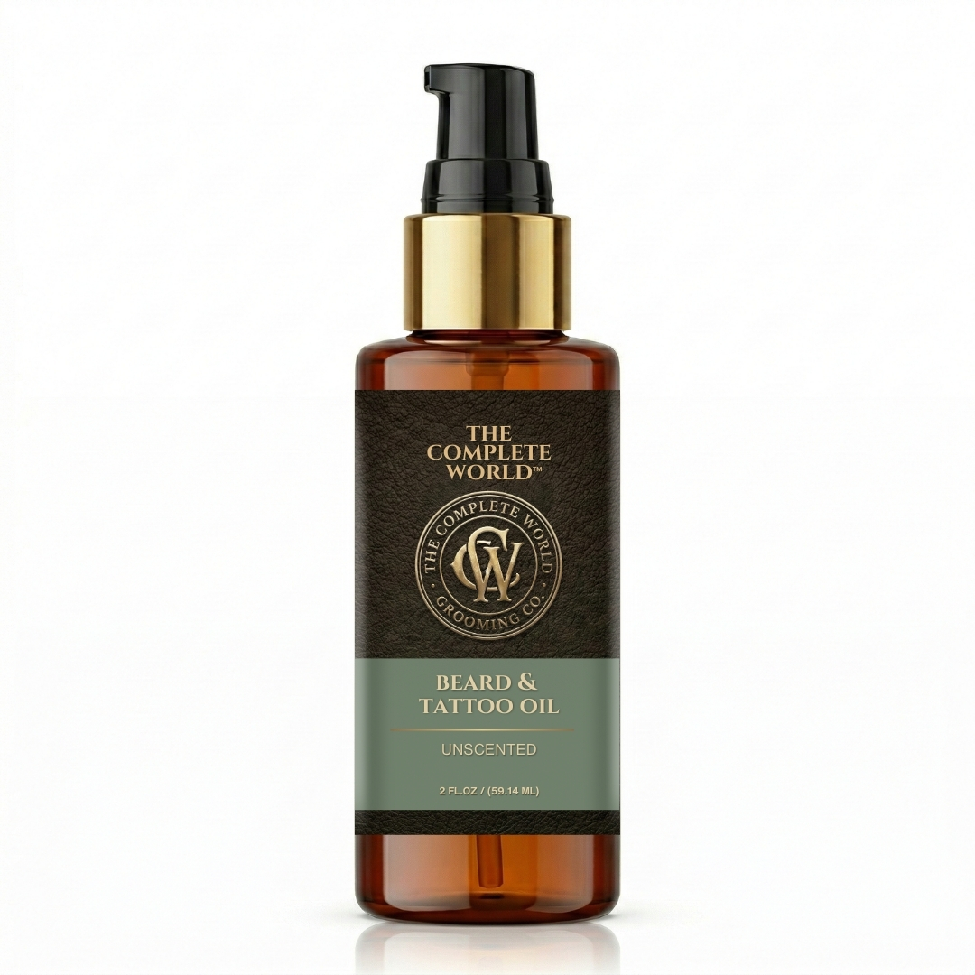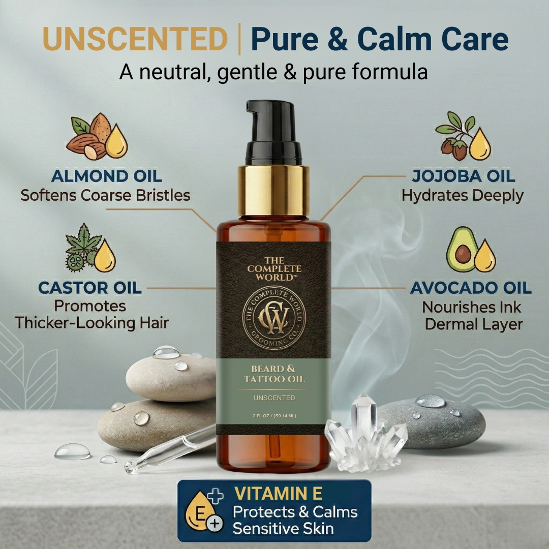 Pure Performance with The Complete World™ Unscented Beard & Tattoo Oil. For the purist who wants results without the fragrance, The Complete World™ Beard & Tattoo Oil in Unscented is your ultimate grooming tool. Whether you have sensitive skin, or simply prefer your signature cologne to do the talking, this fragrance-free formula delivers elite hydration without interference.