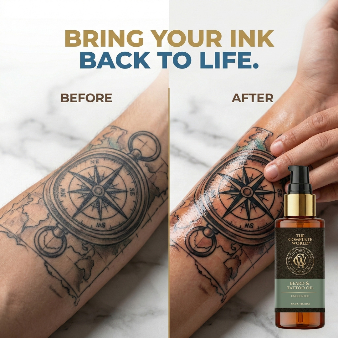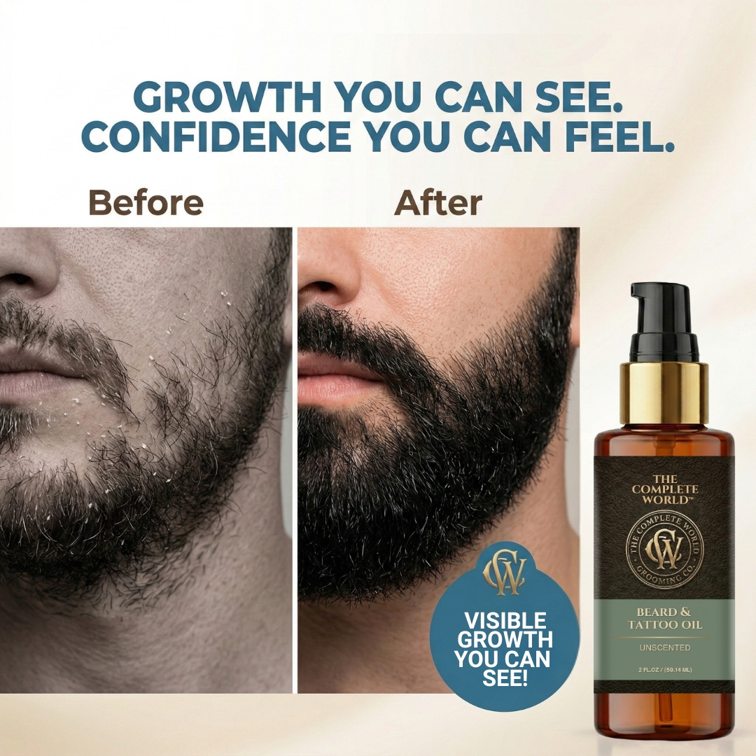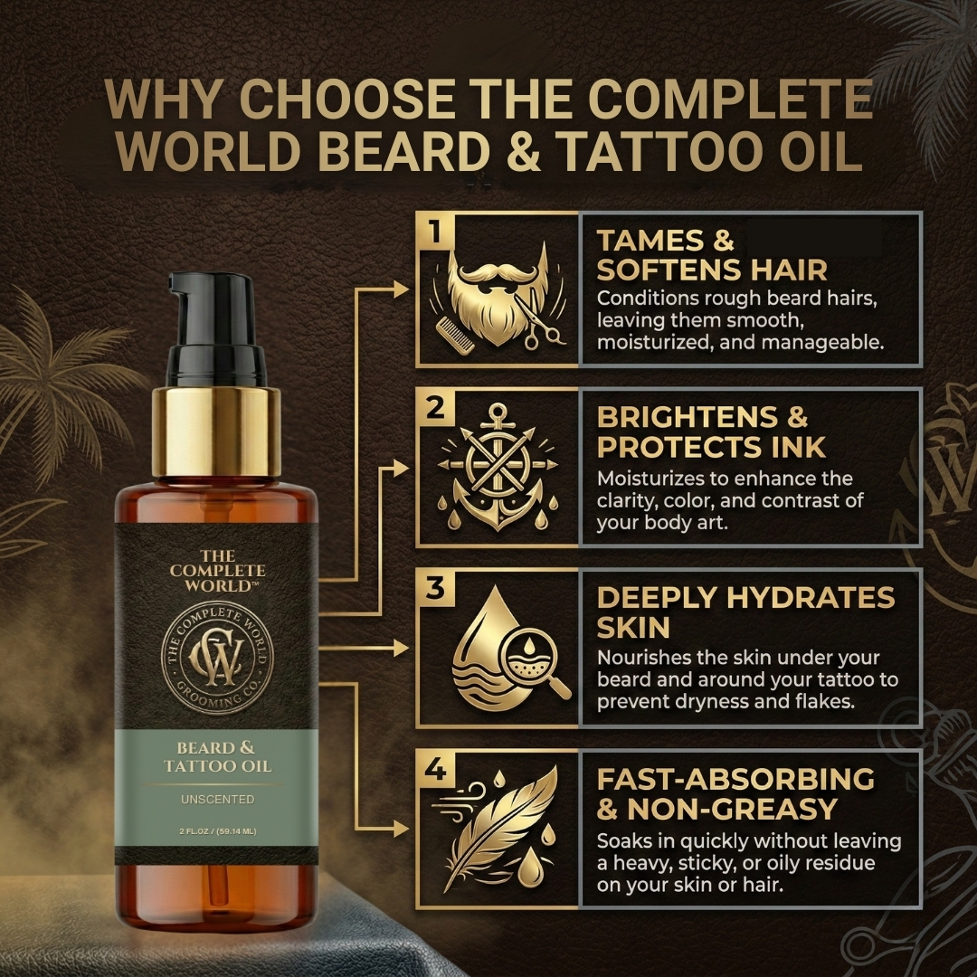 Pure Performance with The Complete World™ Unscented Beard & Tattoo Oil. For the purist who wants results without the fragrance, The Complete World™ Beard & Tattoo Oil in Unscented is your ultimate grooming tool. Whether you have sensitive skin, or simply prefer your signature cologne to do the talking, this fragrance-free formula delivers elite hydration without interference.