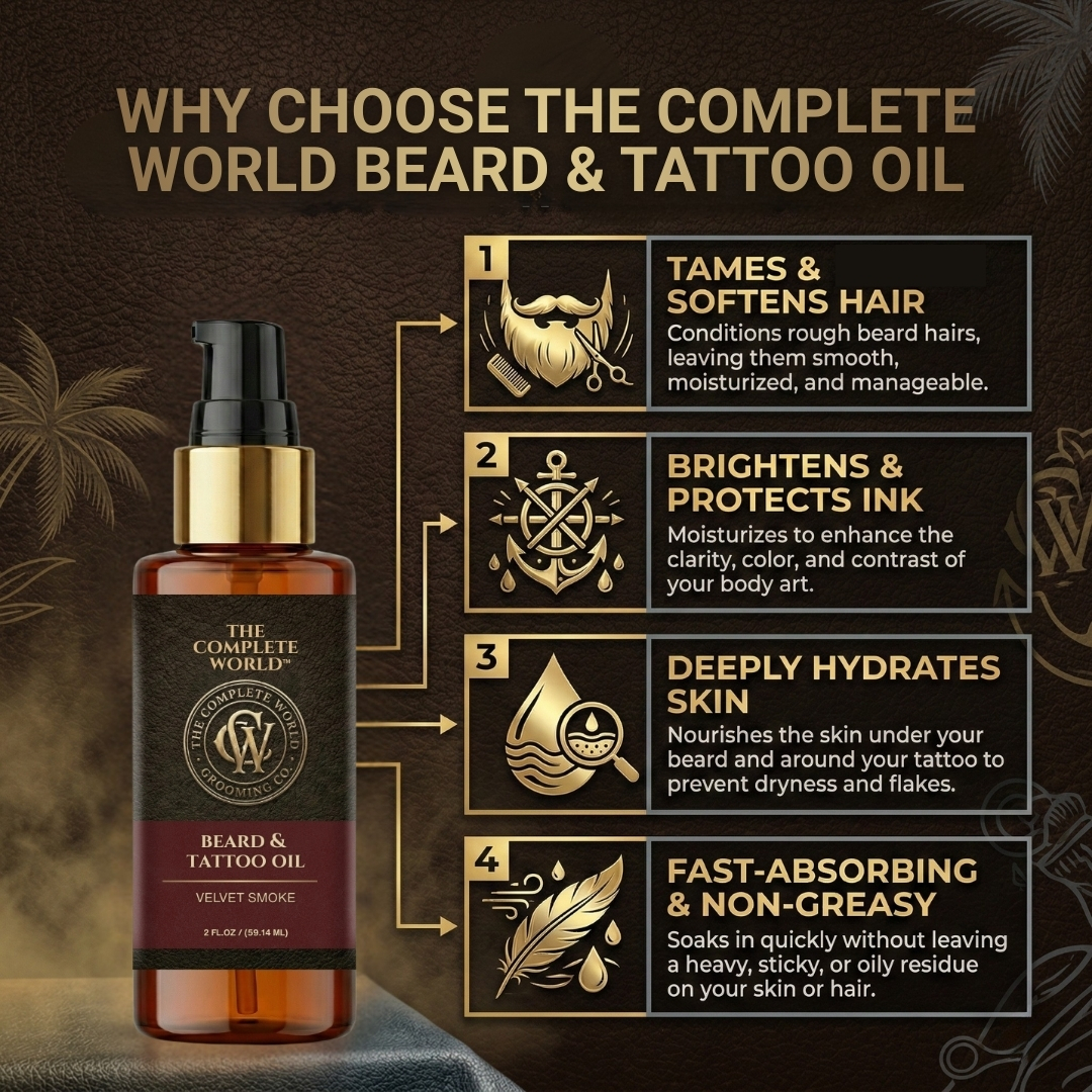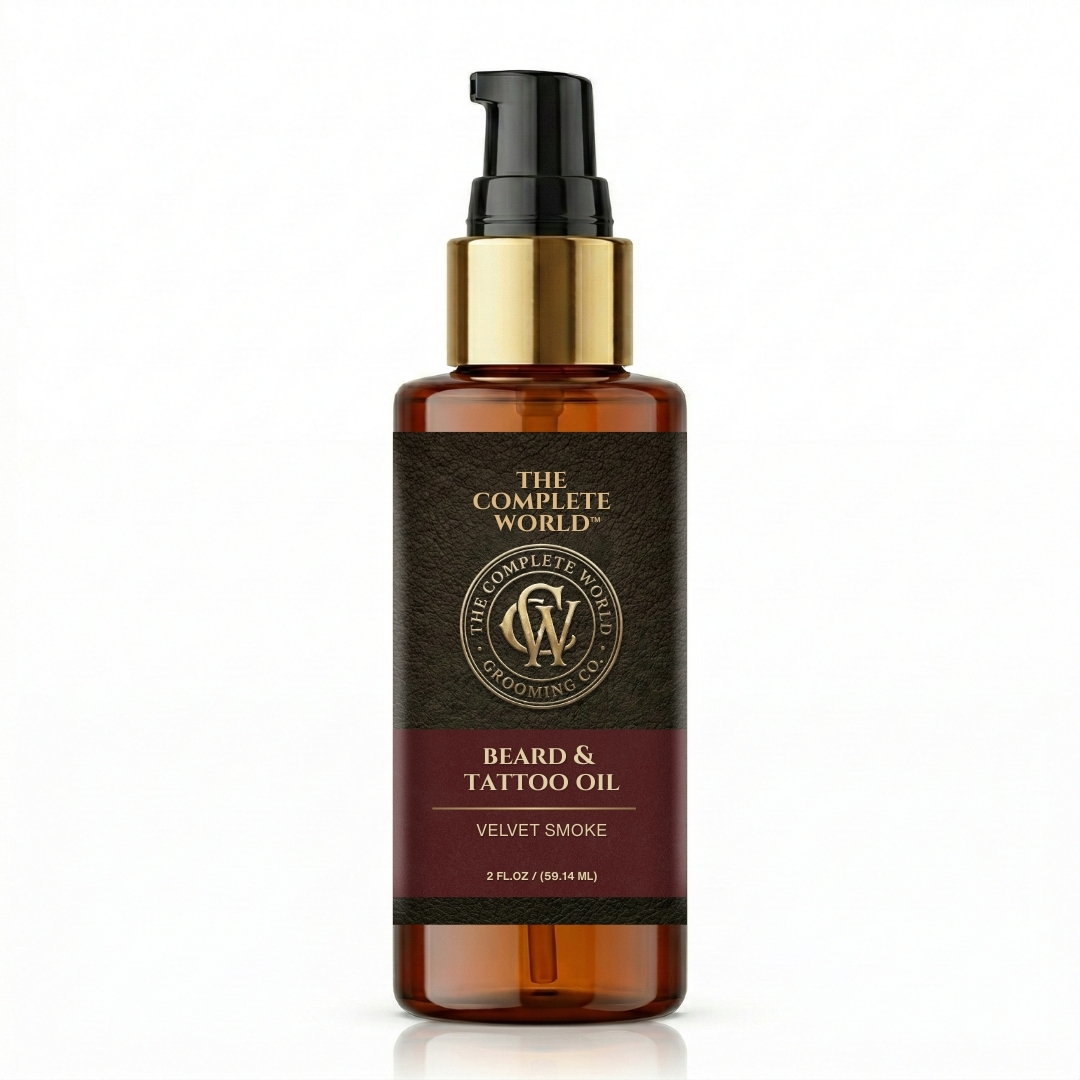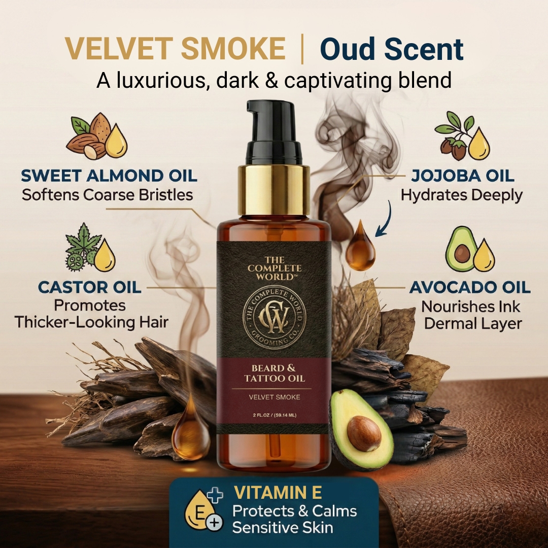 Command Attention with The Complete World™ Velvet Smoke Beard & Tattoo Oil. True grooming goes beyond a simple trim; it requires deep nourishment. The Complete World™ Beard & Tattoo Oil is a luxurious, dual-action formula crafted to perfect your beard and protect your ink. Infused with our signature Velvet Smoke fragrance, this oil envelopes you in the rich, earthy, and smoky aroma of premium Oud wood—the gold standard of masculine scents.