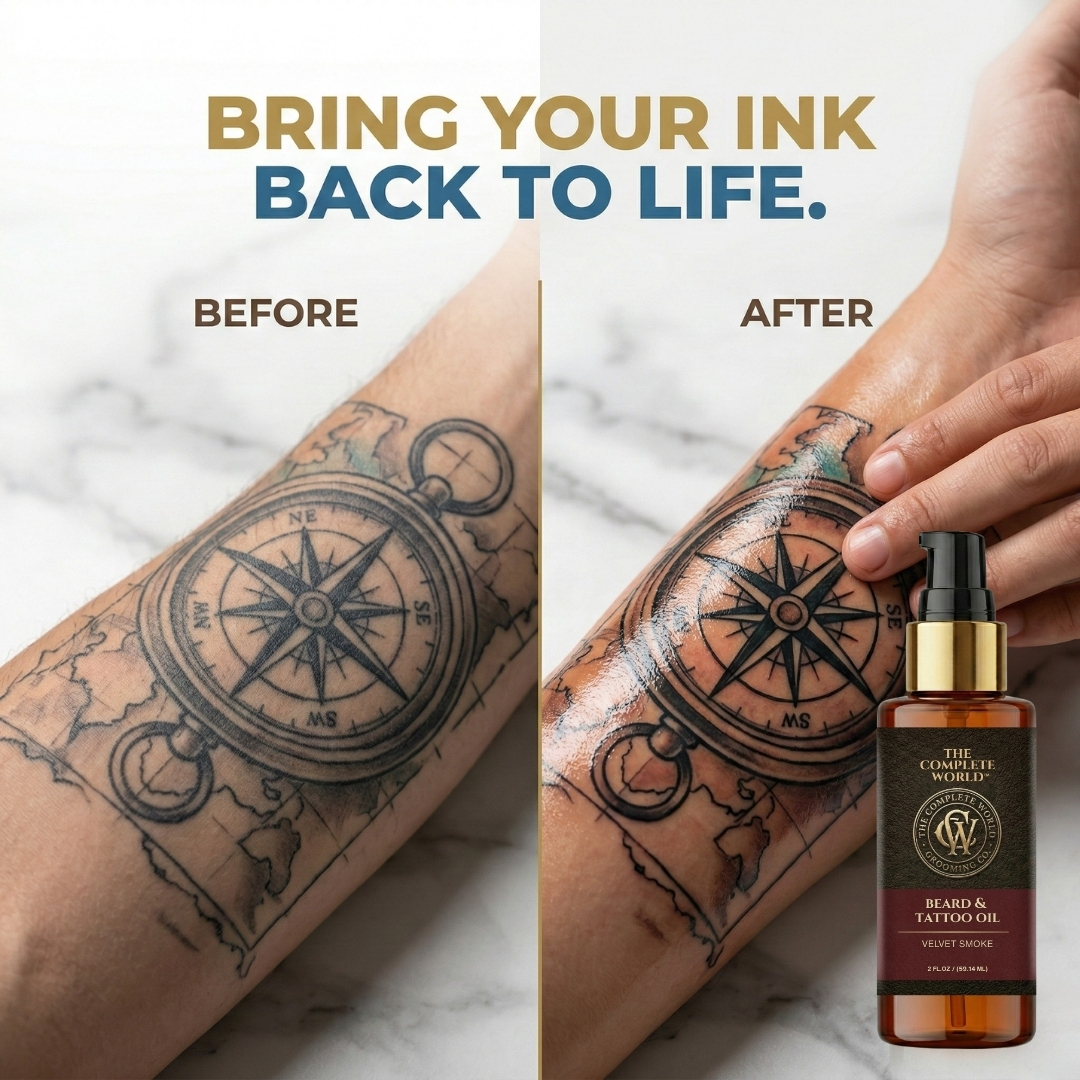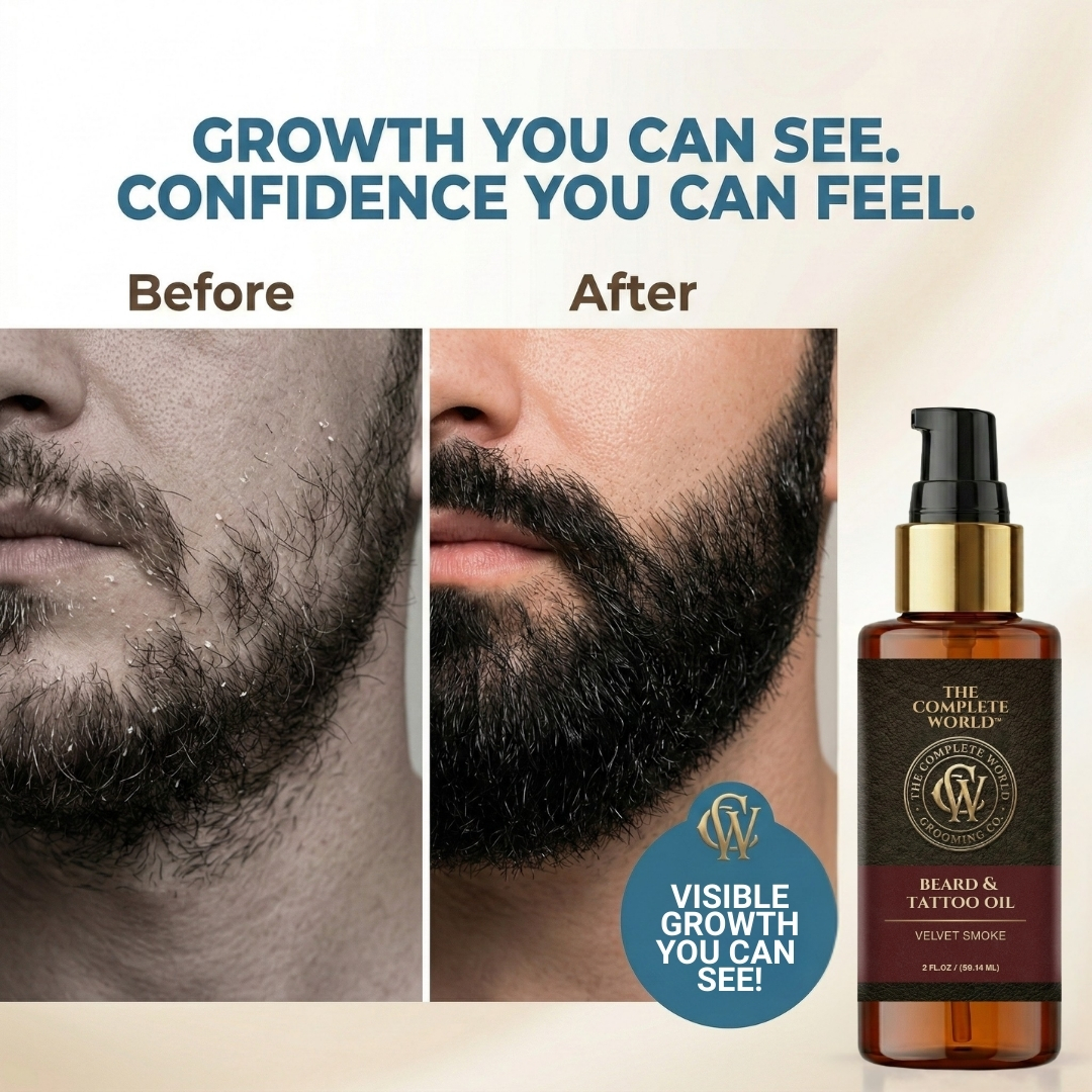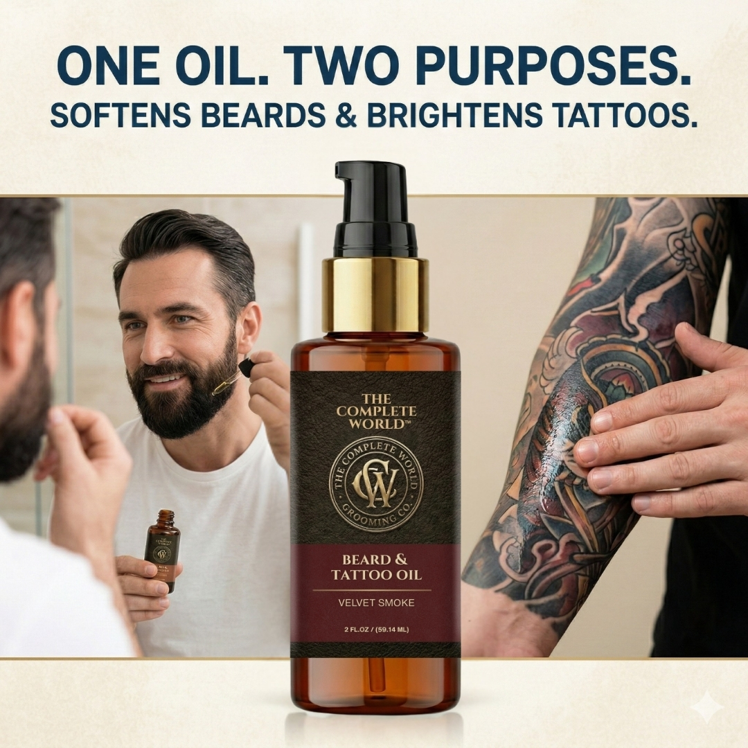 Command Attention with The Complete World™ Velvet Smoke Beard & Tattoo Oil. True grooming goes beyond a simple trim; it requires deep nourishment. The Complete World™ Beard & Tattoo Oil is a luxurious, dual-action formula crafted to perfect your beard and protect your ink. Infused with our signature Velvet Smoke fragrance, this oil envelopes you in the rich, earthy, and smoky aroma of premium Oud wood—the gold standard of masculine scents.