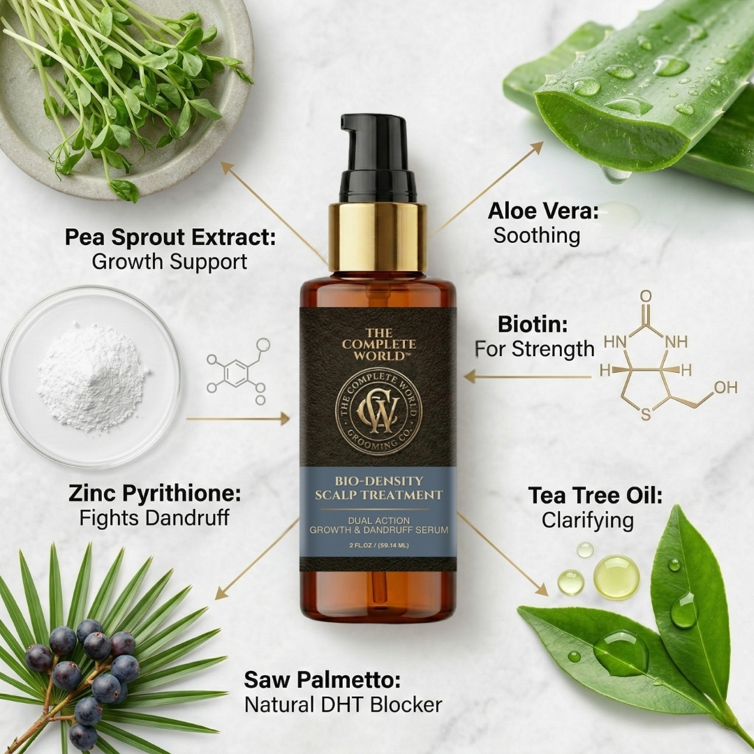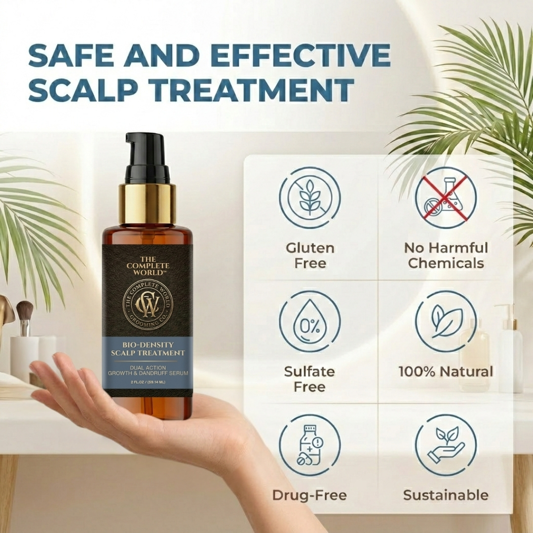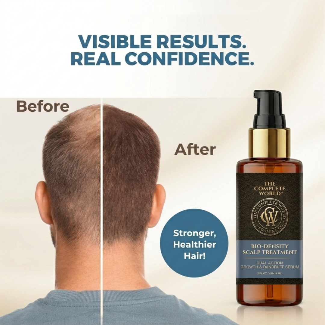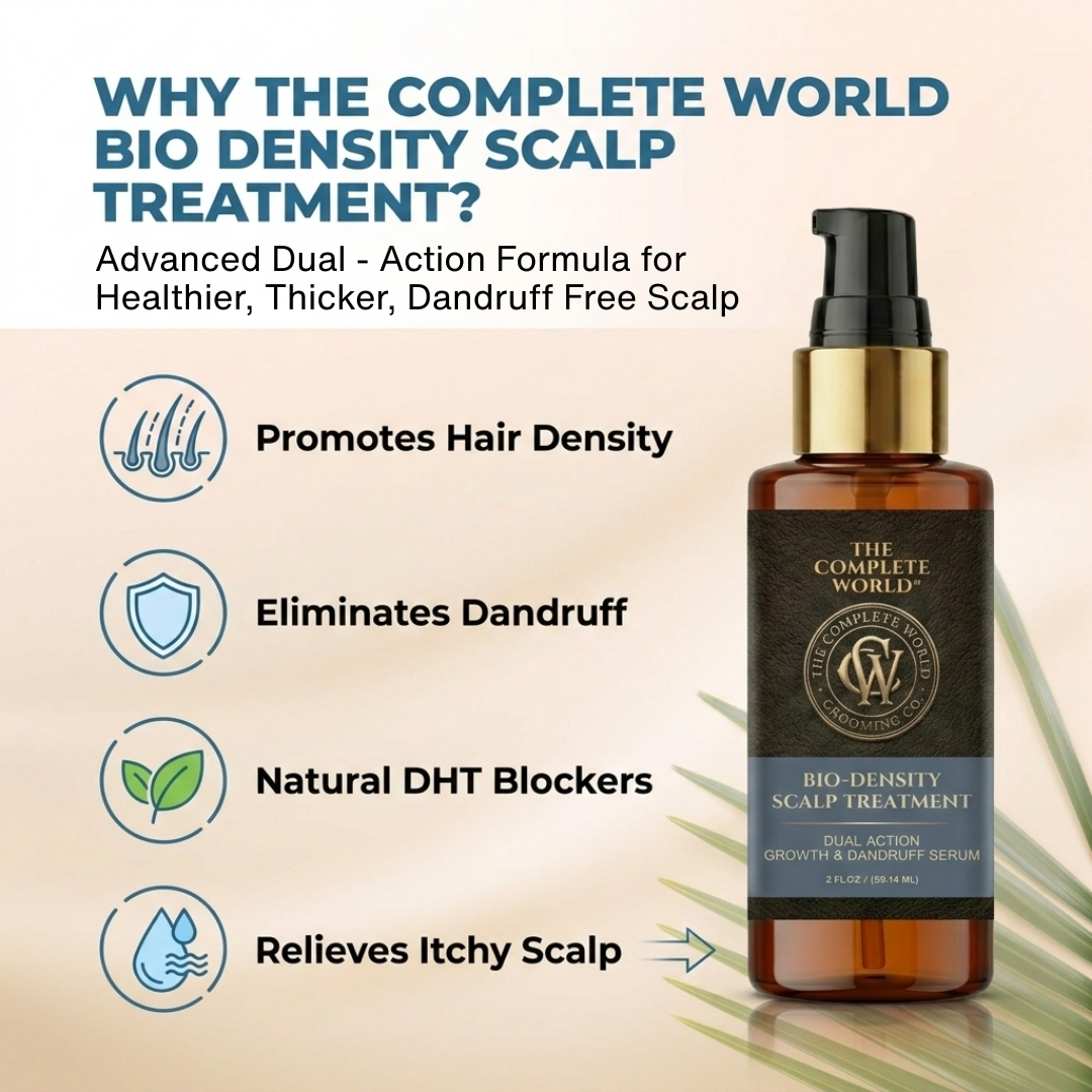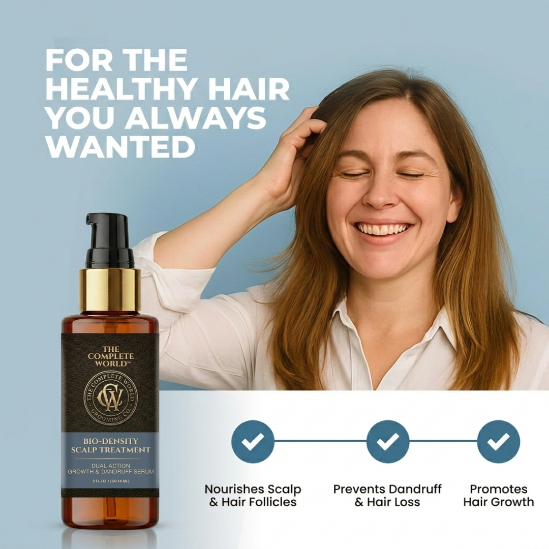 Struggling with thinning hair and a flaky, itchy scalp? You shouldn’t have to choose between promoting hair growth and fighting dandruff. The Complete World™ Bio-Density Scalp Treatment is a premium, dual-action serum designed to target the root of your scalp concerns. Formulated with a powerhouse blend of clinically recognized ingredients, this daily leave-in treatment revitalizes hair follicles, stimulates dense growth, and purifies the scalp to banish dandruff for good.